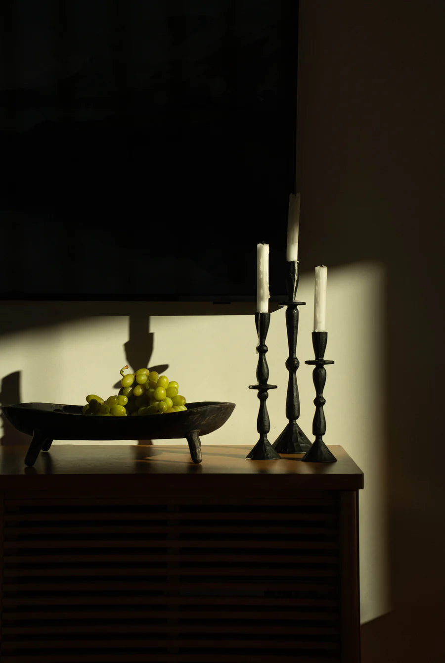 Elevate your tablescape with the hand forged aluminum Imani Candle Holder, handmade in Moradabad, a city in India celebrated for its metal craftsmanship. The creamy neutral powder coating seamlessly combines contemporary flair with traditional manufacturing techniques, resulting in a stunning matte finish that exudes dramatic character. Add a sense of romance and occasion to everyday evenings by lighting candles at dinnertime, or by curating a vignette with a mix of sizes on a side console.