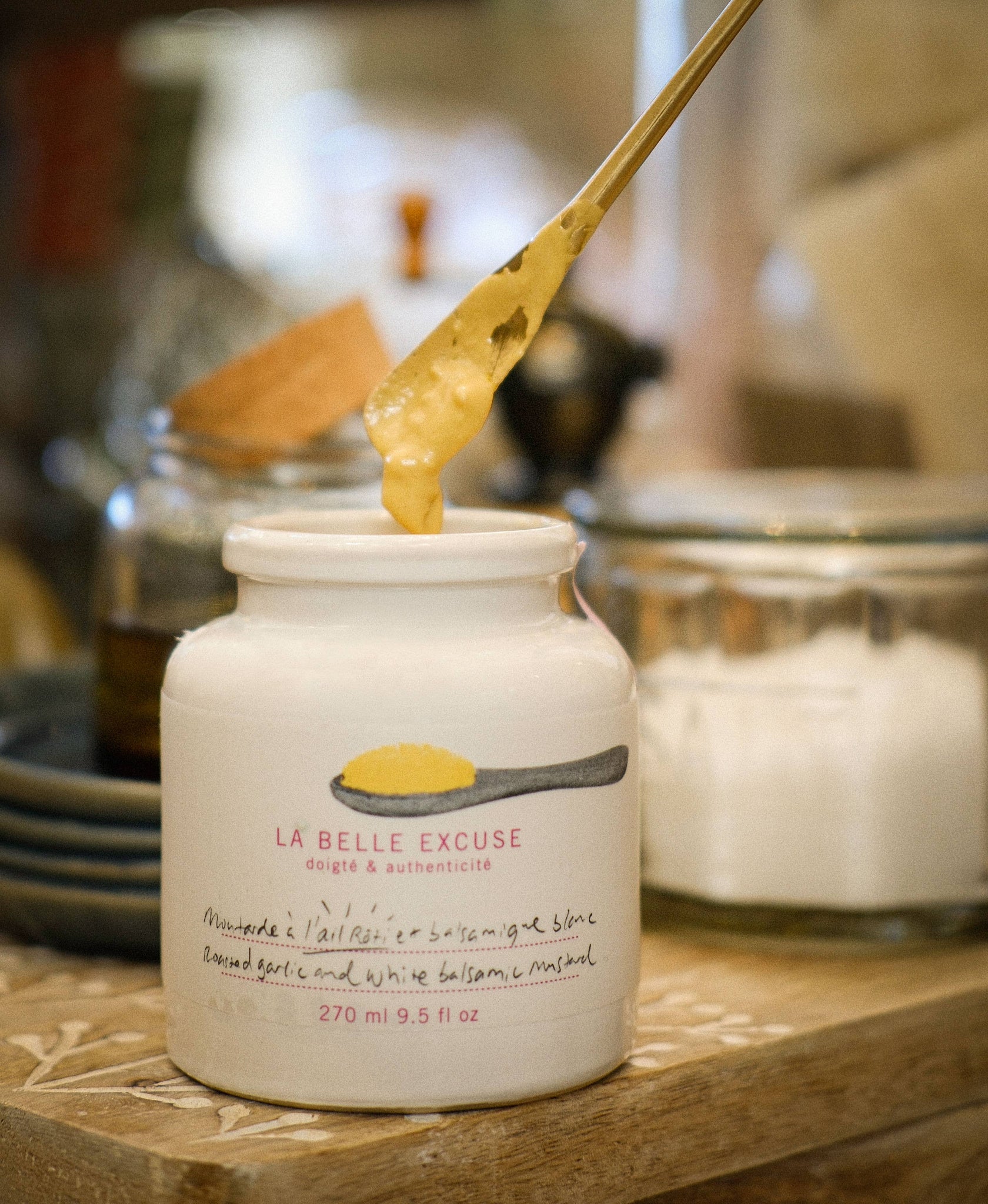 LA BELLE EXCUSE offers you a tasty mustard with olive oil, roasted garlic, and white balsamic vinegar. Emulsified with La Belle Excuse green olive oil, this delicious mustard has a rich creamy texture, enhanced by the subtle aroma of roasted garlic and the tangy sweetness of white balsamic vinegar. A natural artisanal mustard to liven up all your favourite dishes! Your taste buds and guests will be delighted. Its appetizing name also happens to be the entire list of ingredients.